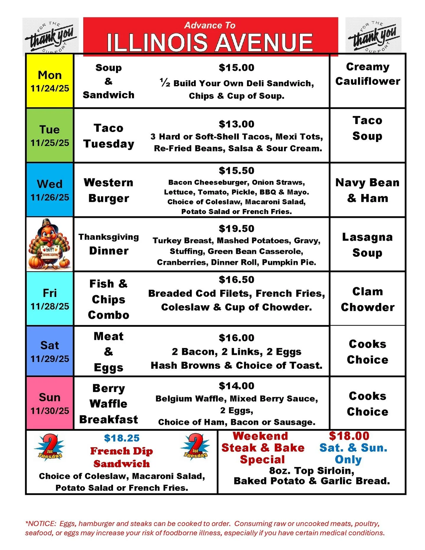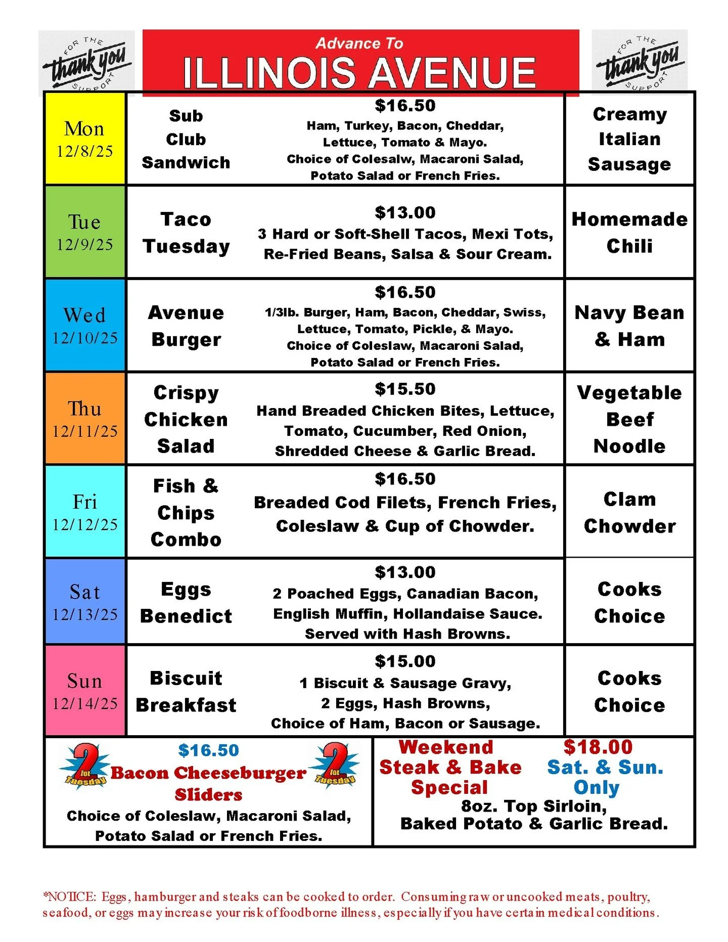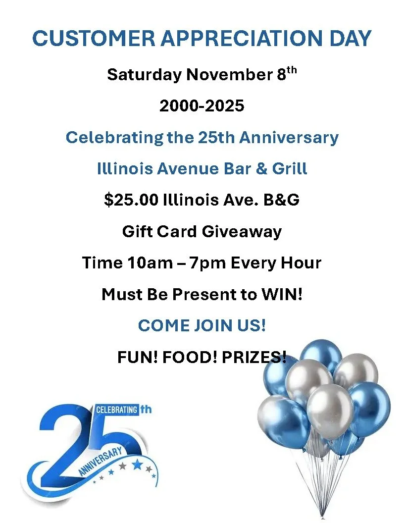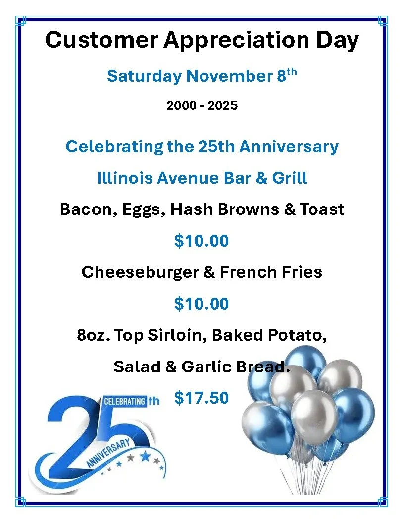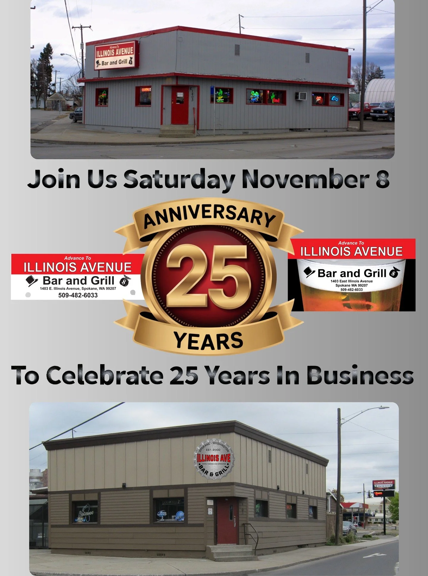 In early 2000, four brothers and their spouses came together to help Rod, the eldest brother, find a business to run. After exploring various opportunities, they acquired an older tavern in Spokane called "Jimmies Tavern." Following renovations, painting, and other improvements, they opened the Illinois Avenue Bar and Grill on November 8, 2000. This year, 2025, marks our 25th year in operation. Along with the name change, we transitioned from a tavern to a bar, now offering a selection of not only beer and wine but also mixed drinks and a full food menu